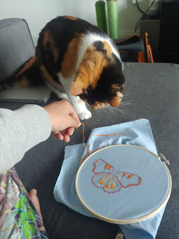 The delight I get when I spot a butterfly fluttering from flower to flower on a bright summer's day is what inspired me to create this piece. I wanted to frame a special moment in nature with all it’s colours and textures and used needle painting techniques to bring it to life. Picking up embroidery has taught me to be more patient in creating art. It’s become another medium I have enjoyed exploring with my hands.